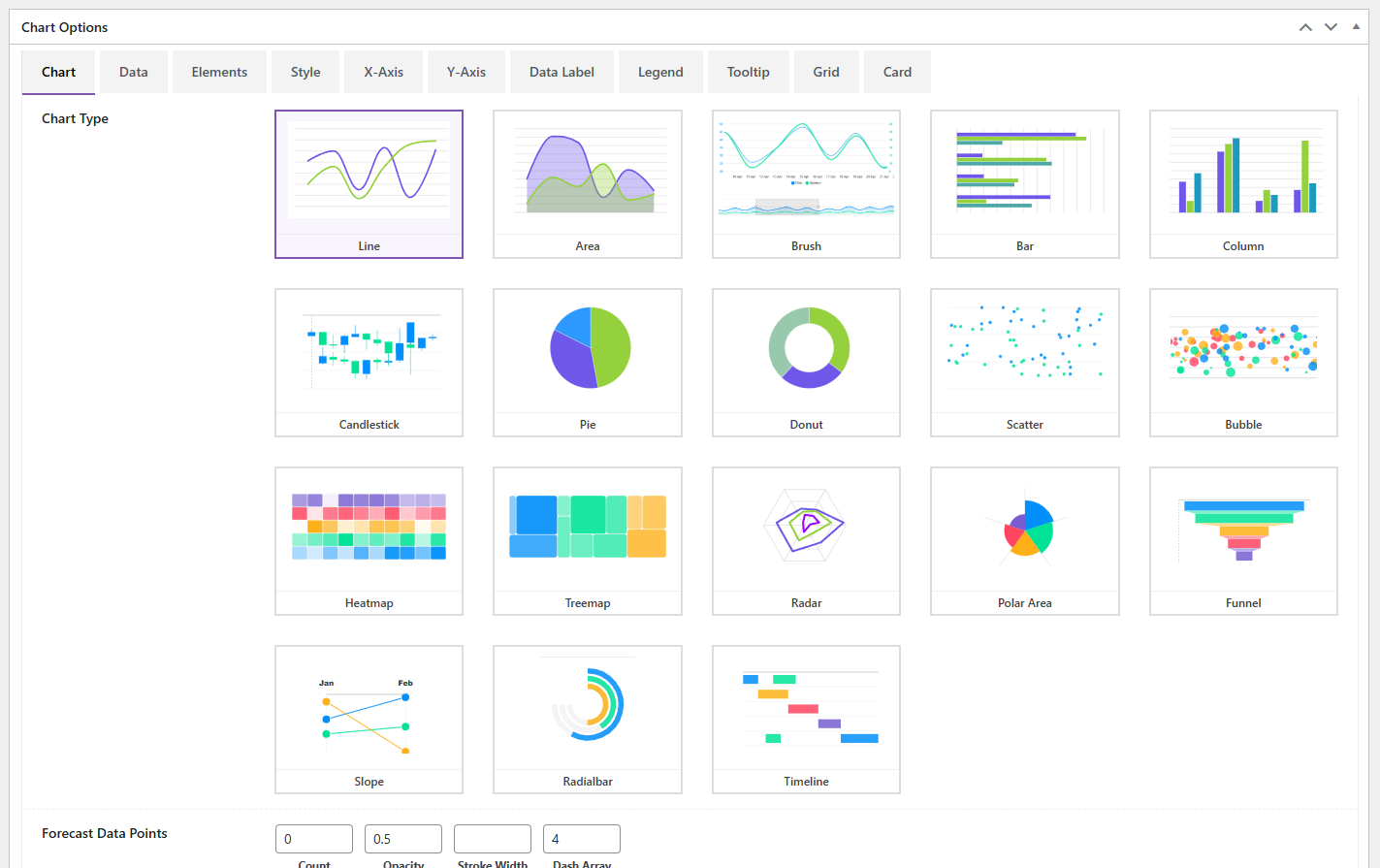 ⭐ 18+ Advanced Chart Types – Create everything from standard Line, Area, and Bar charts to complex Candlestick, Heatmap, Treemap, Timeline, Radar, and Polar Area visualizations.