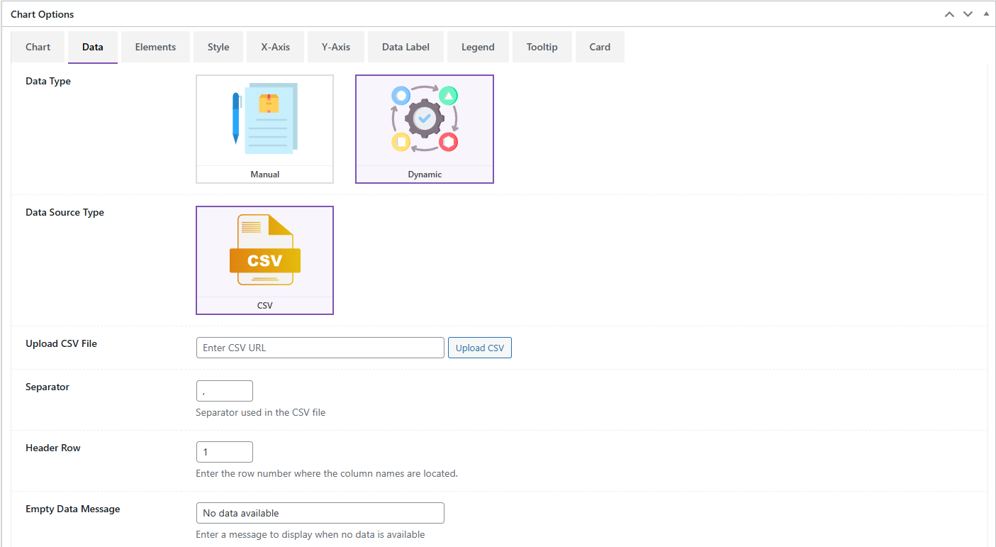 ⭐ Flexible Data Connection – Connect to manual data entry, local or remote CSV files, Google Sheets, SQL databases, REST APIs, or use custom WordPress filters for deep programmatic integration.