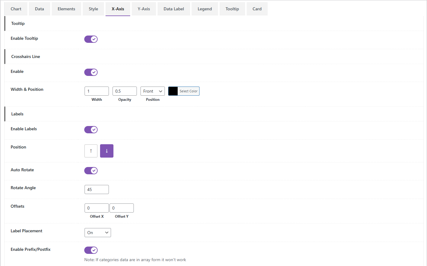 X-Axis Settings – Customize labels, categories, positioning, and formatting for the horizontal axis.